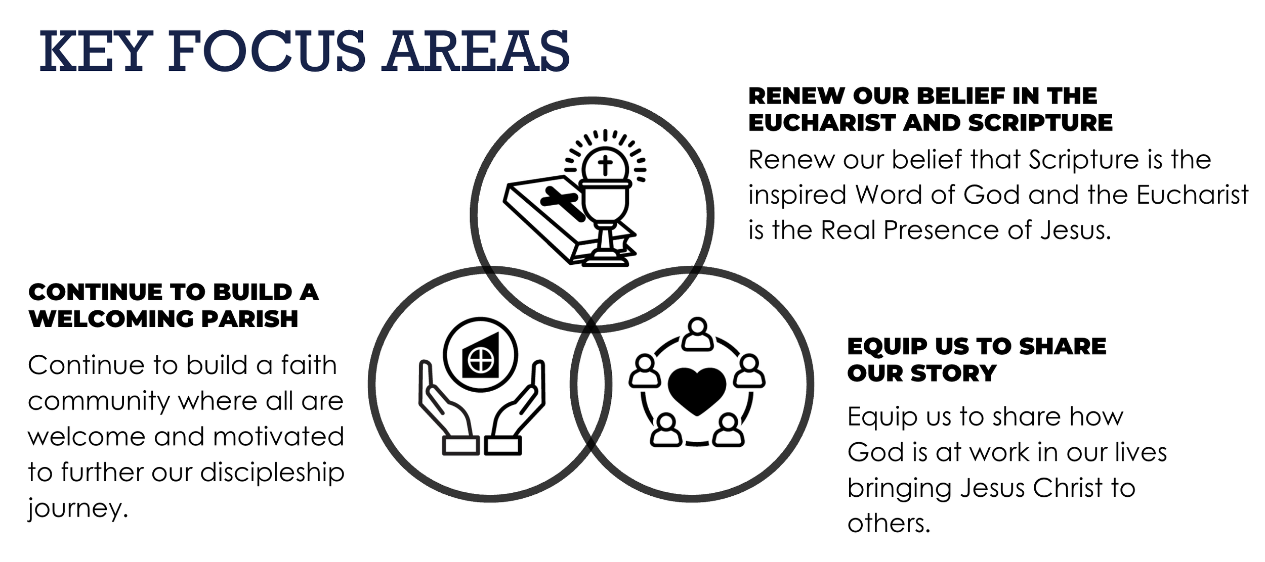 We use these three focus areas as guiding principles for evaluating ministerial initiatives to ensure alignment with parish priorities.